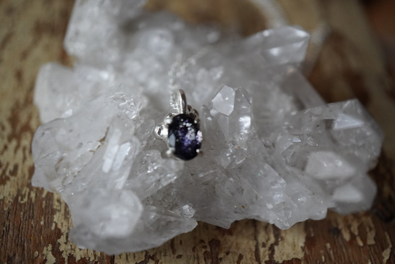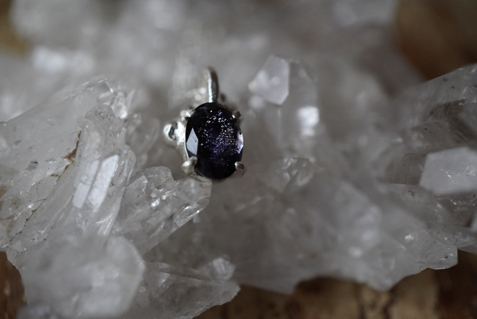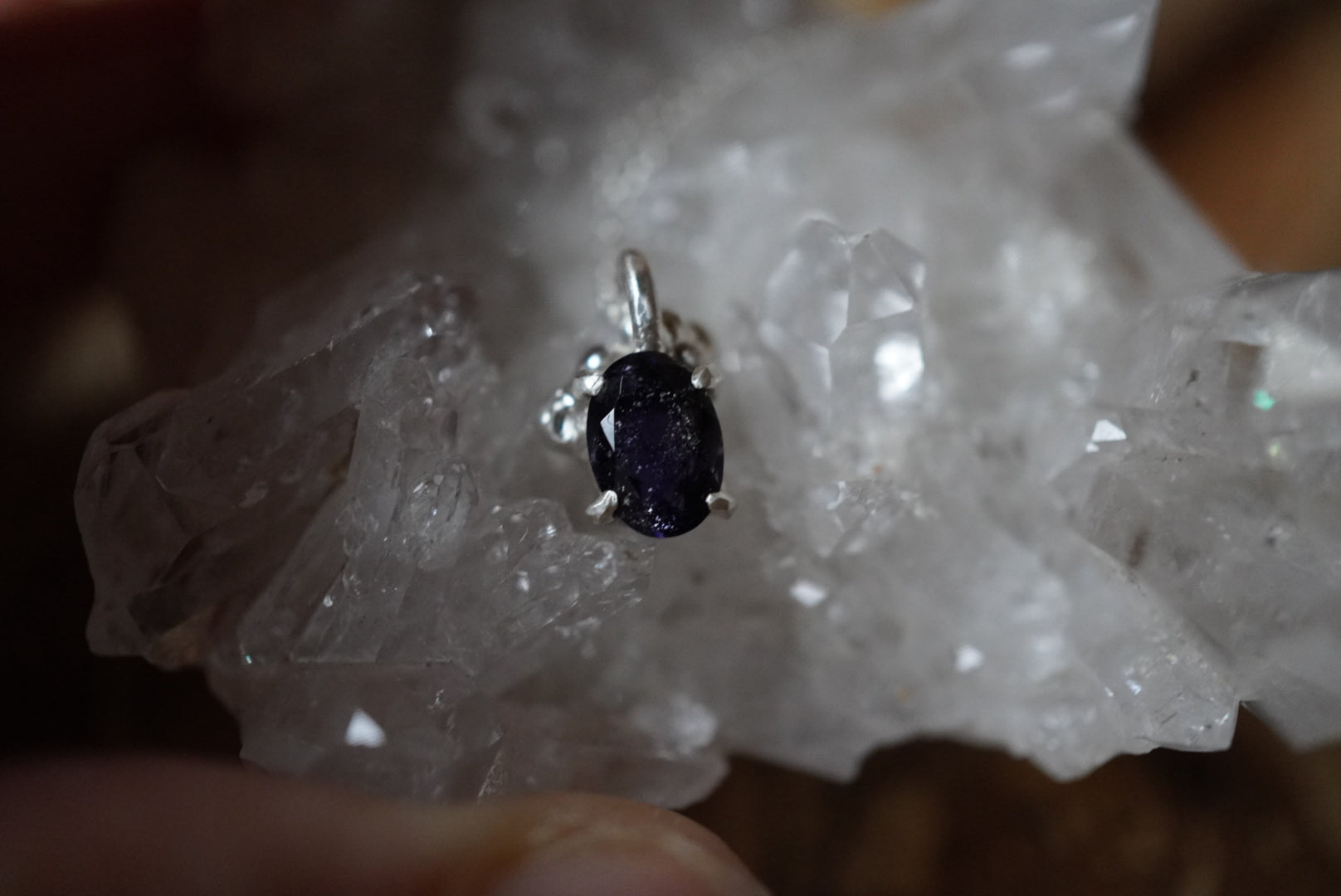 深い菫色が特徴のアイオライトに銀河のような星が浮かび上がるアイオライトサンストーンです。
