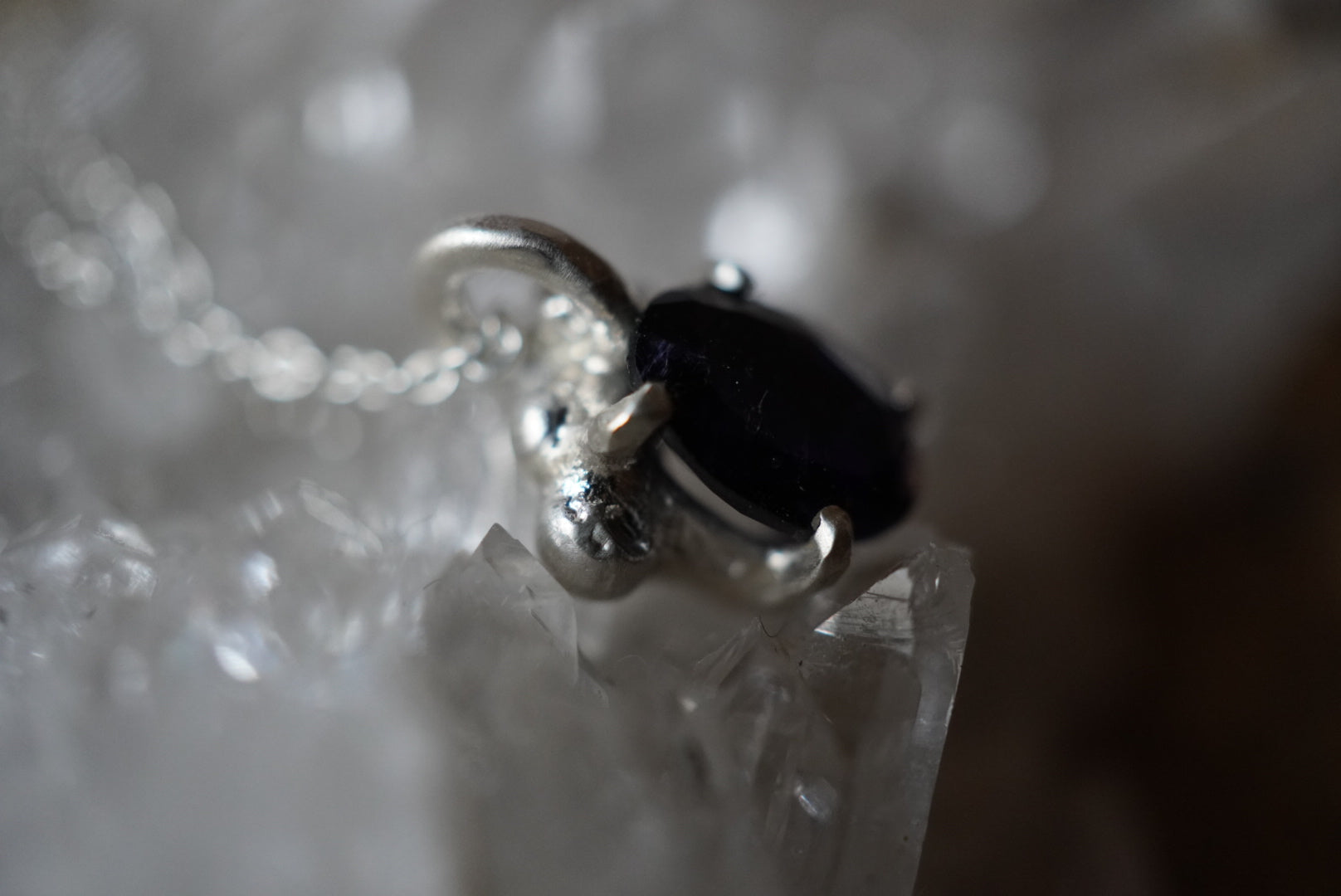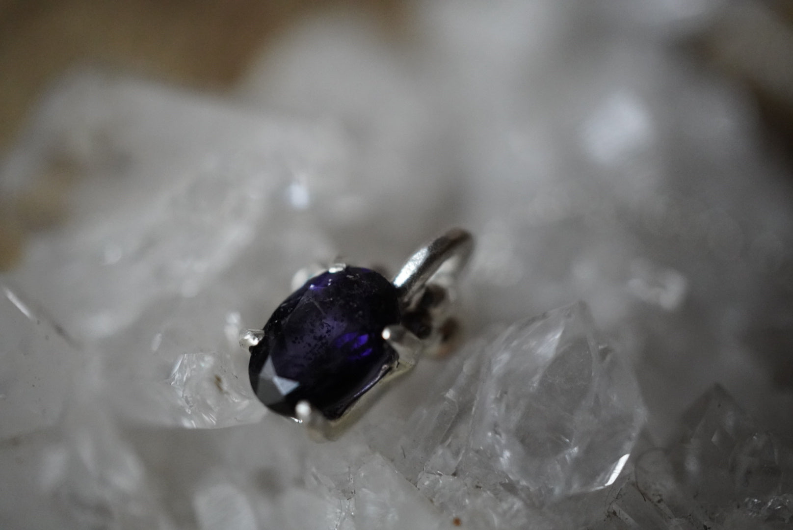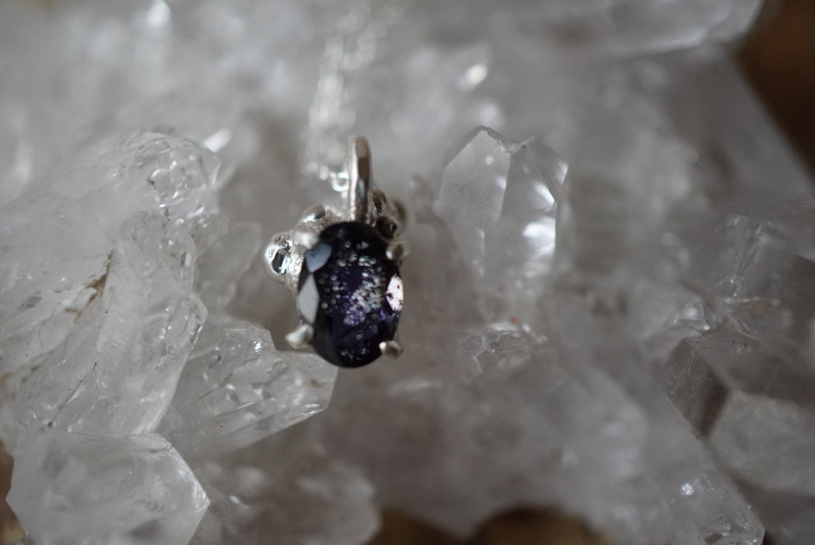 深い菫色が特徴のアイオライトに銀河のような星が浮かび上がるアイオライトサンストーンです。