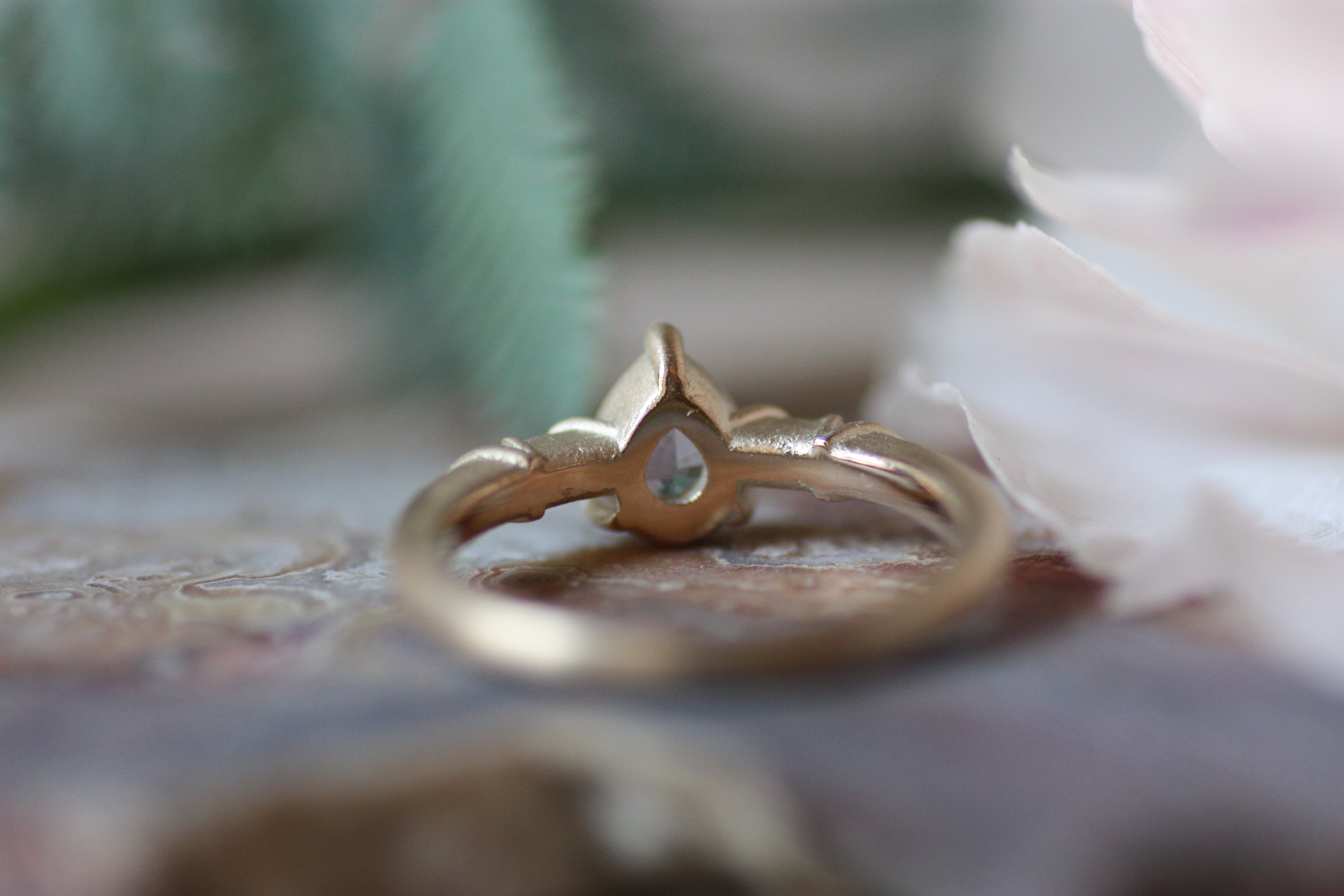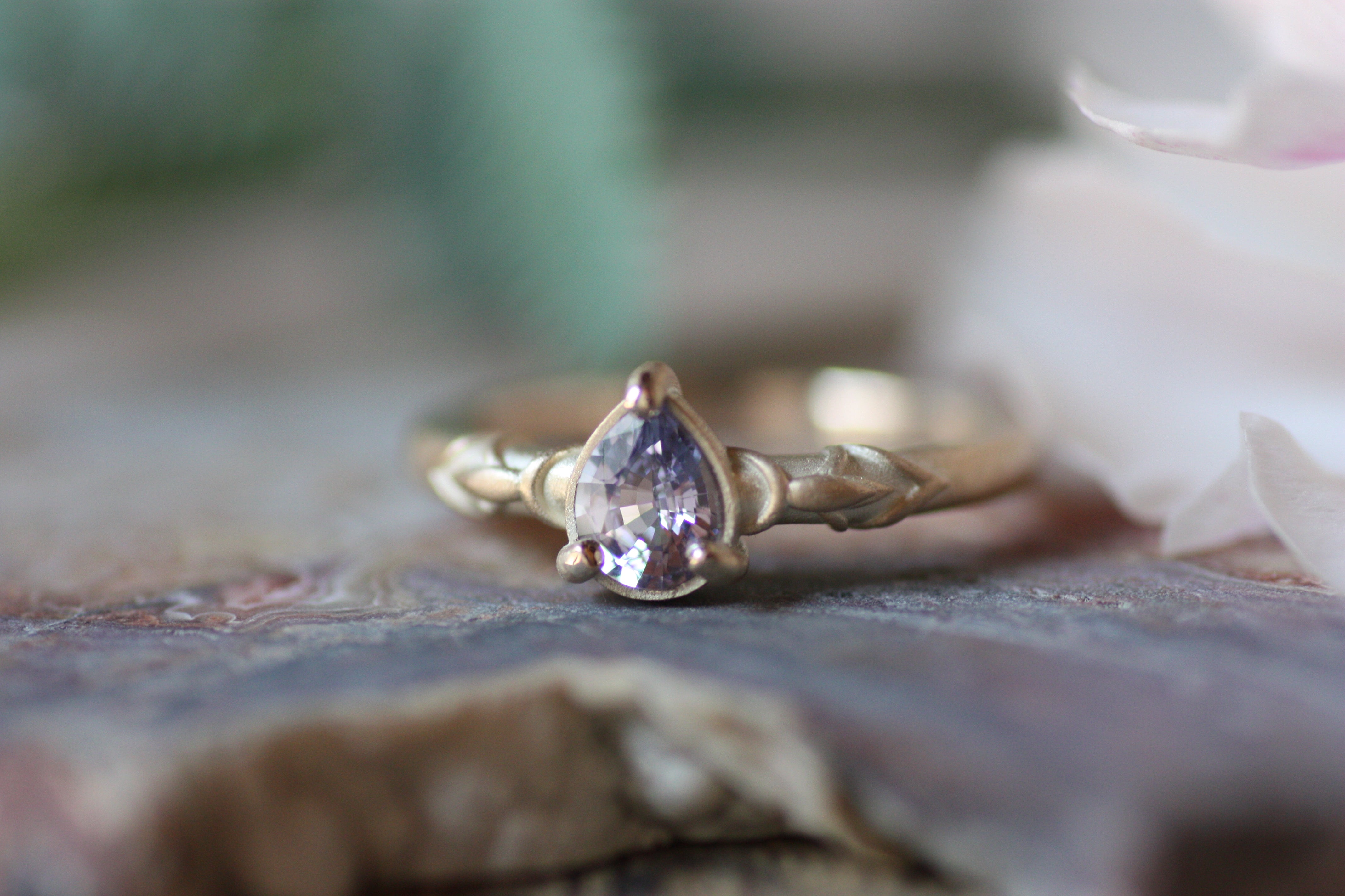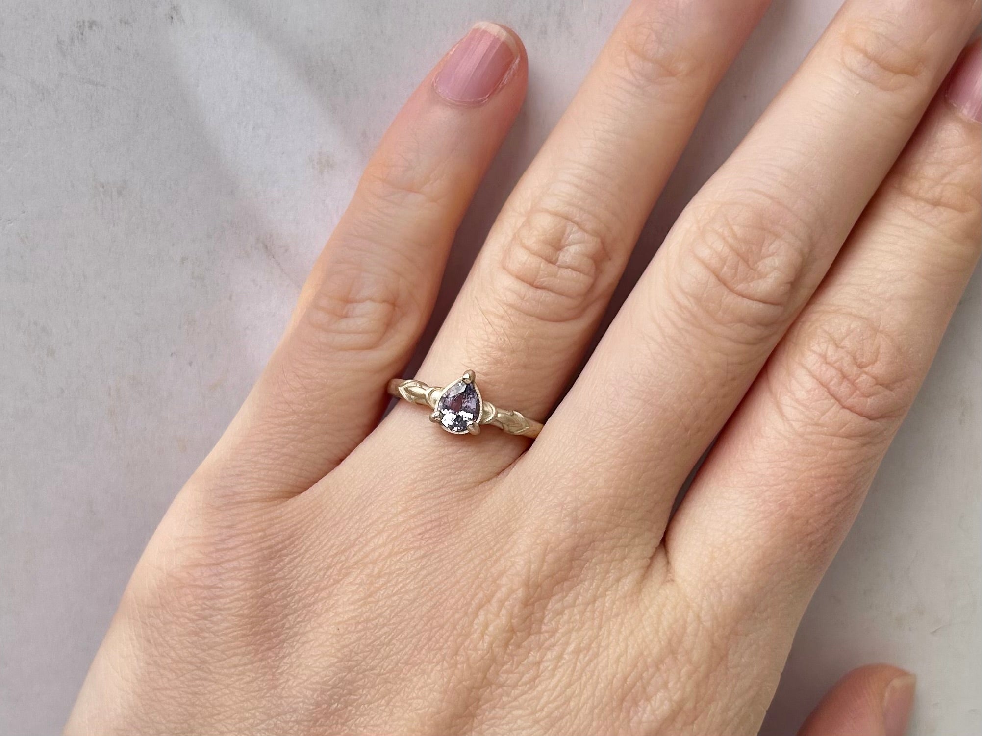 雫型のなんとも妙なる色合いのスピネルにそんなイメージを持ちました。見れば見るほど不思議とつかみどころのない色が煌めきます。