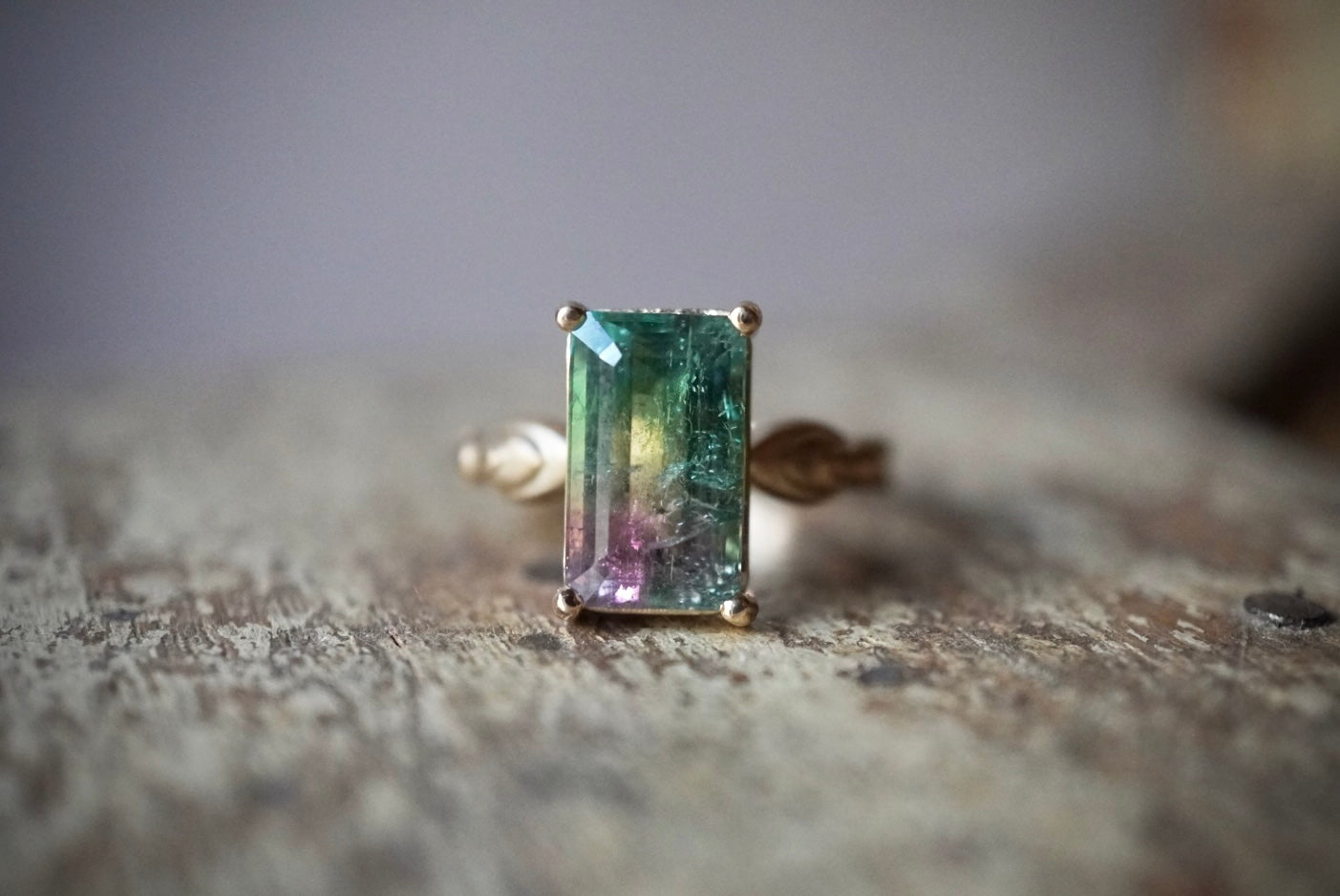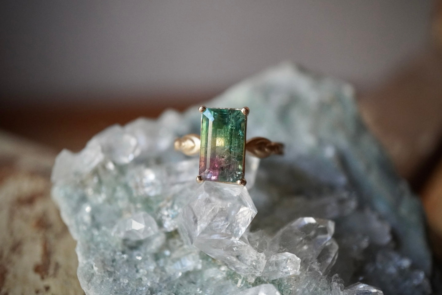 バイカラートルマリンはくっきりと色が分かれているものが多く見られる中、ほんのりと火を灯すように見える赤い色がアクセントになったトルマリンです。