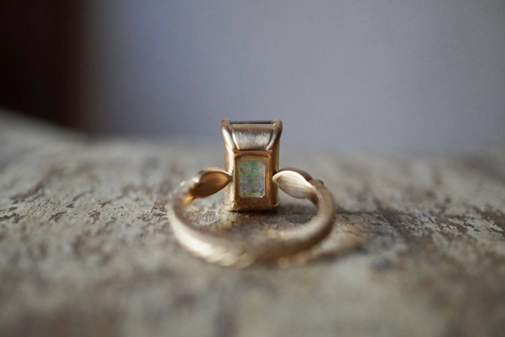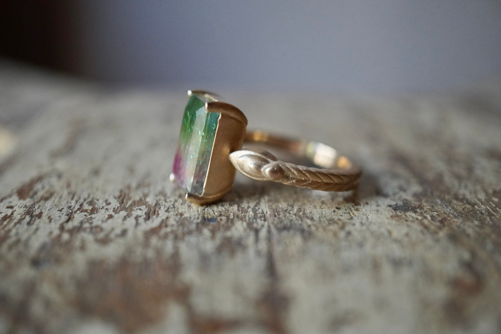 「鳳凰」と名付けたデザインはこの石のために作成したものです。鳳凰の尾がぐるりと一周するようなデザインと輝くバイカラートルマリンを楽しんでいただけたらと思います。