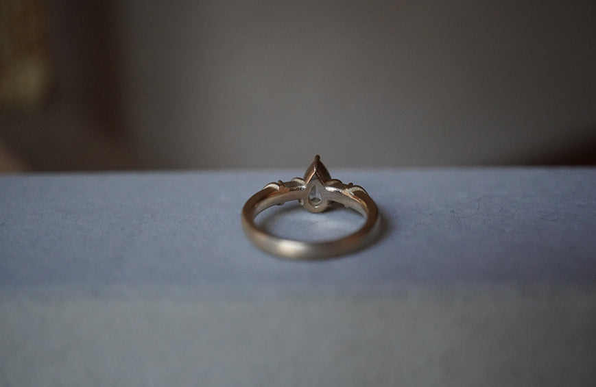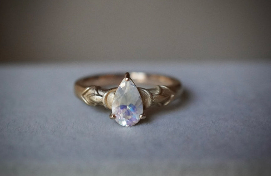 アンデシンラブラドライト(レインボームーンストーン)は長石の中でアンデシンとラブラドライトの中間に属する鉱物です。レインボームーンストーンの通称名の通り、虹色の光を持つ石です。品質によってさまざまな表情を見せますが、こちらは透明度も高く、ブルーを中心としたパステルカラーの光が大変に美しいピースを『天平』のデザインで留めました。