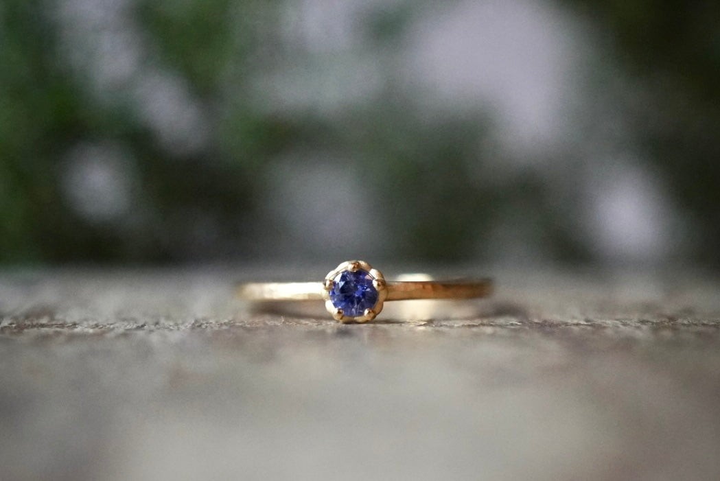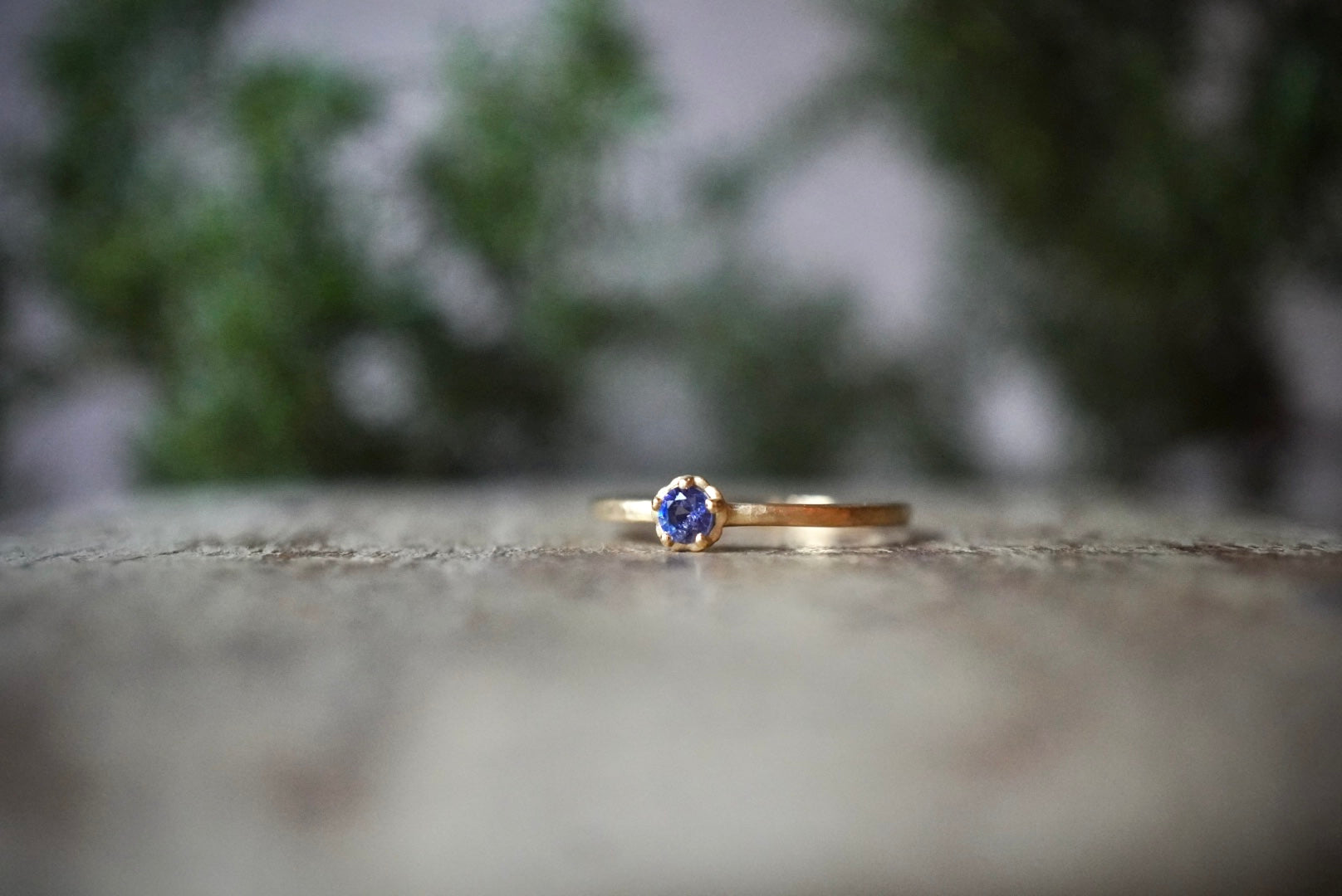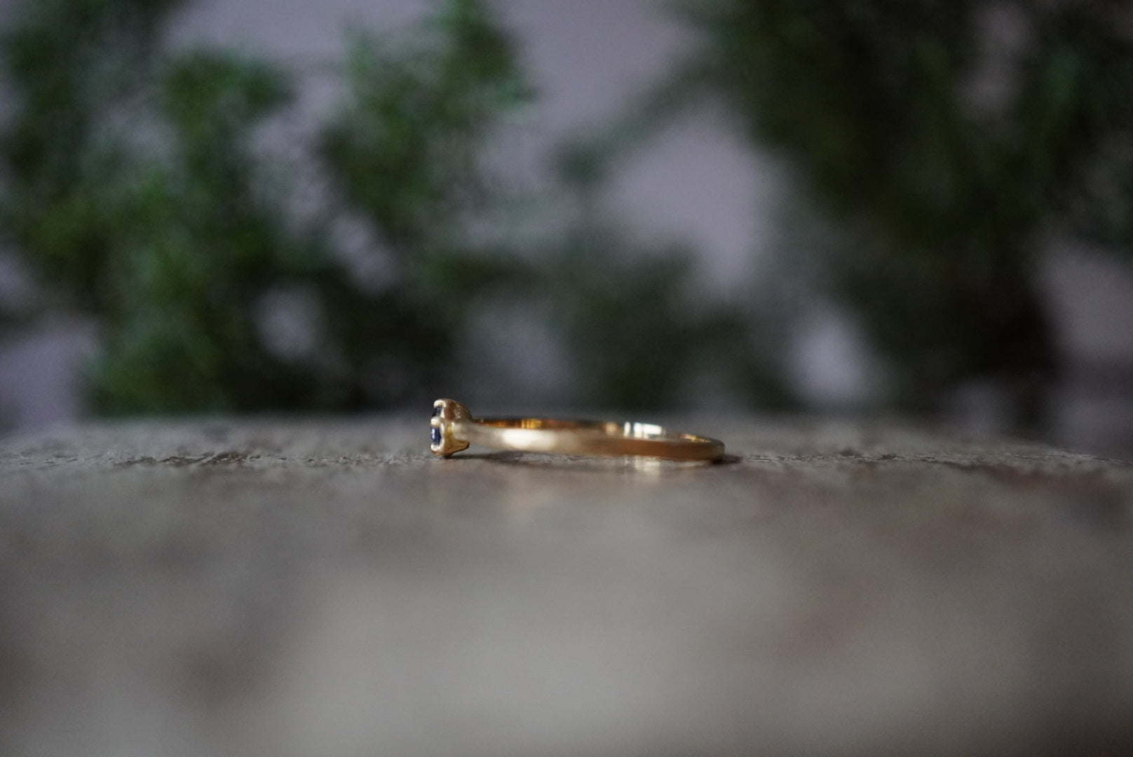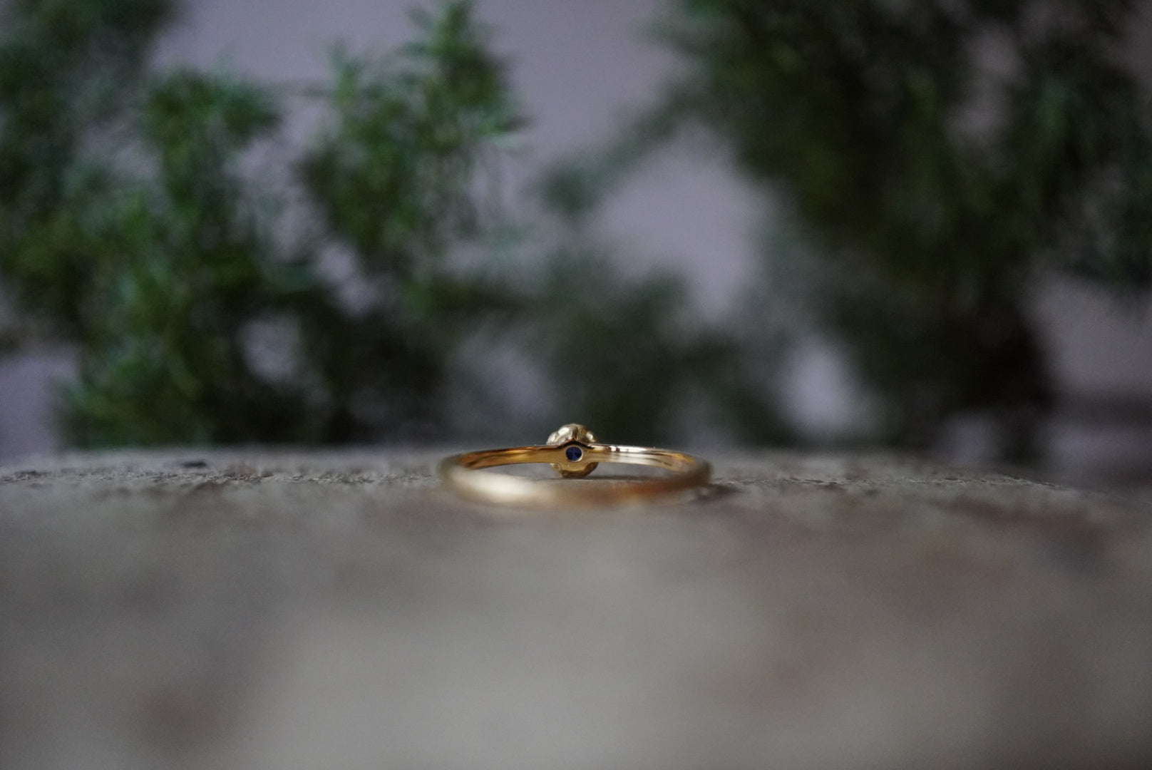 ベニトアイトはアメリカ原産のレアストーンです。鉱山も閉鎖され、幻の石になりつつあります。「サファイヤの色にダイヤモンドの輝き」と言われる珍しい石ですが、ほんの小さな石でも驚くような高値が付いています。こちらもとても小さなピースですが、色も濃く、大きさも華奢な指環としては十分な大きさのあるピース。星のような繊細な煌めきの指環です。
