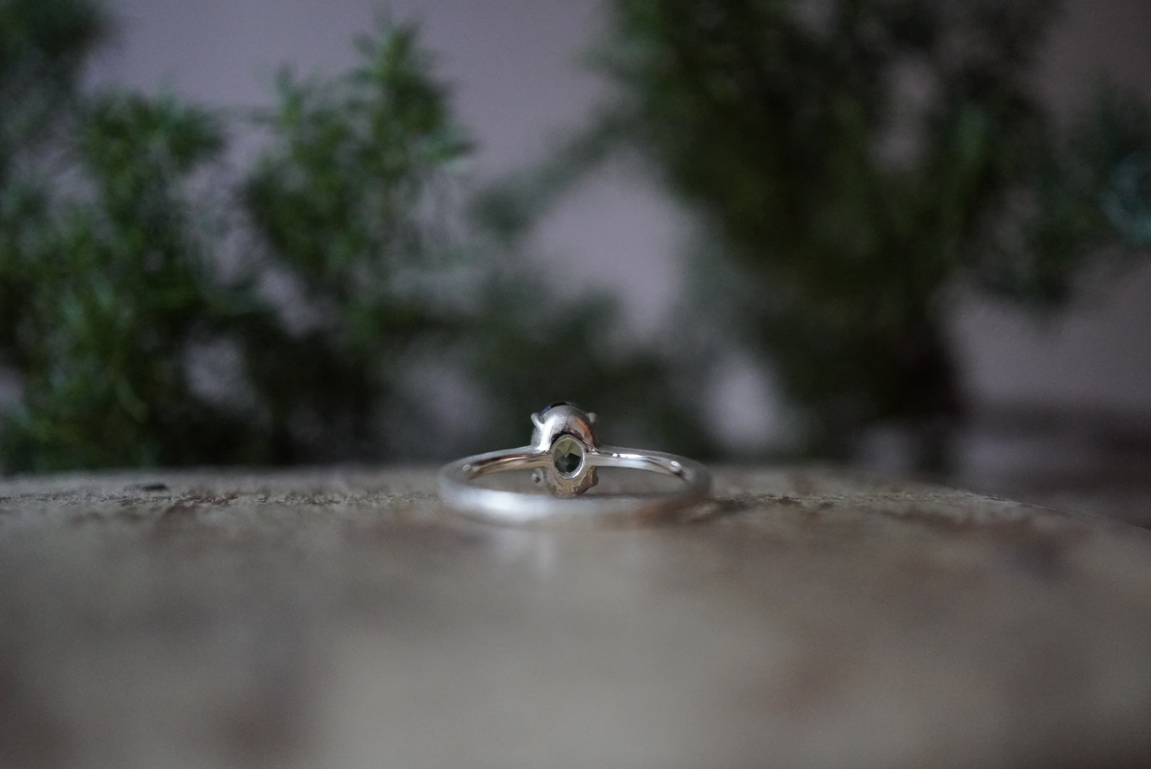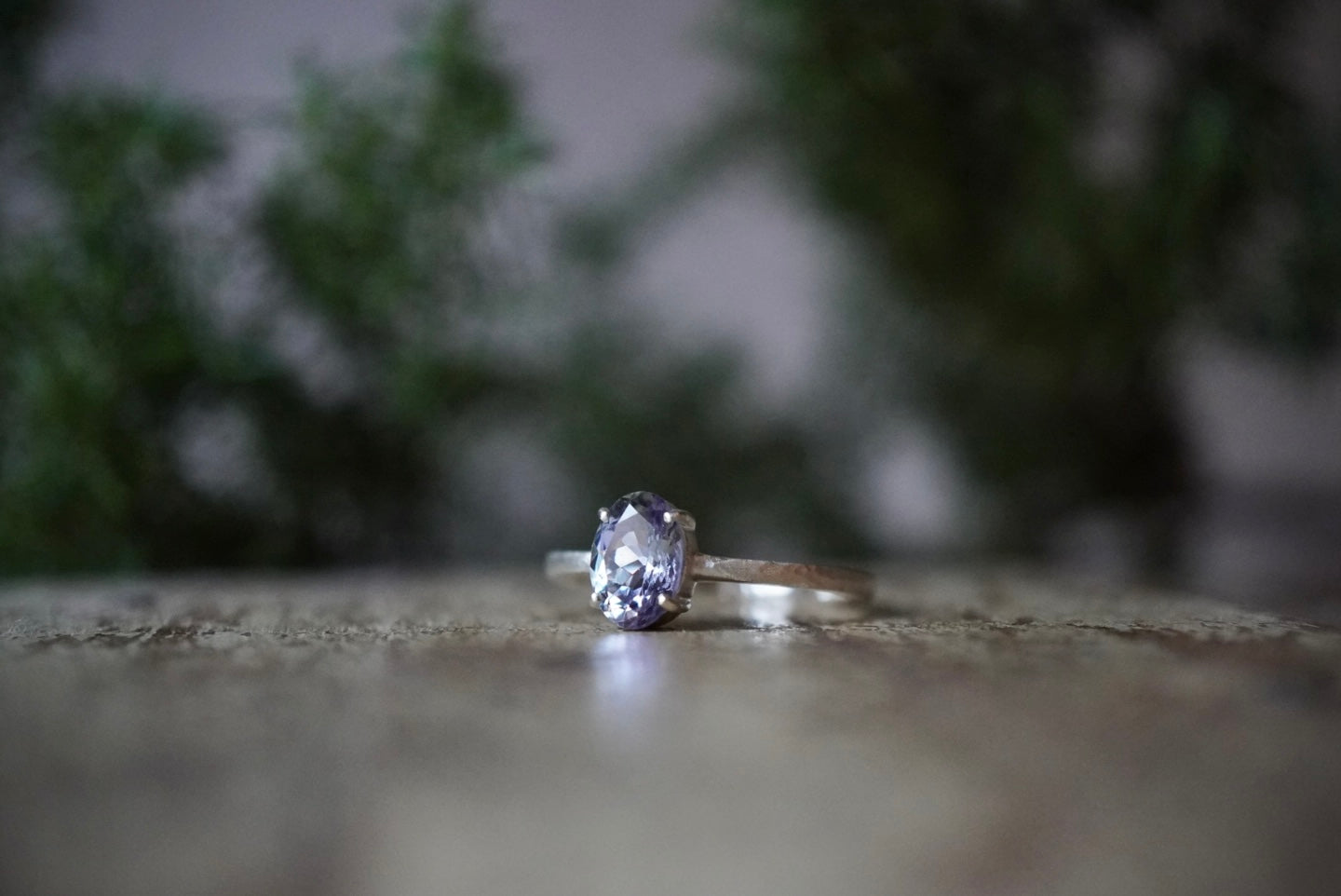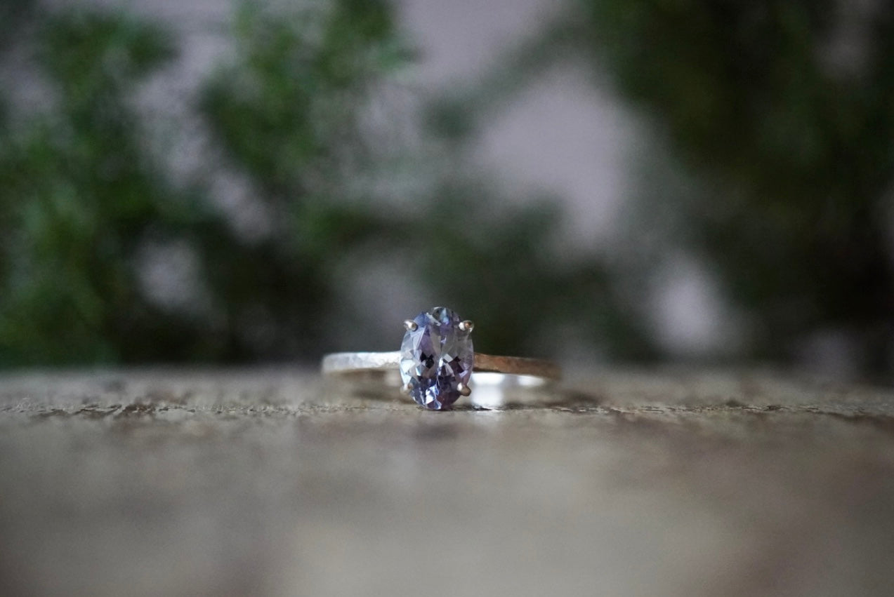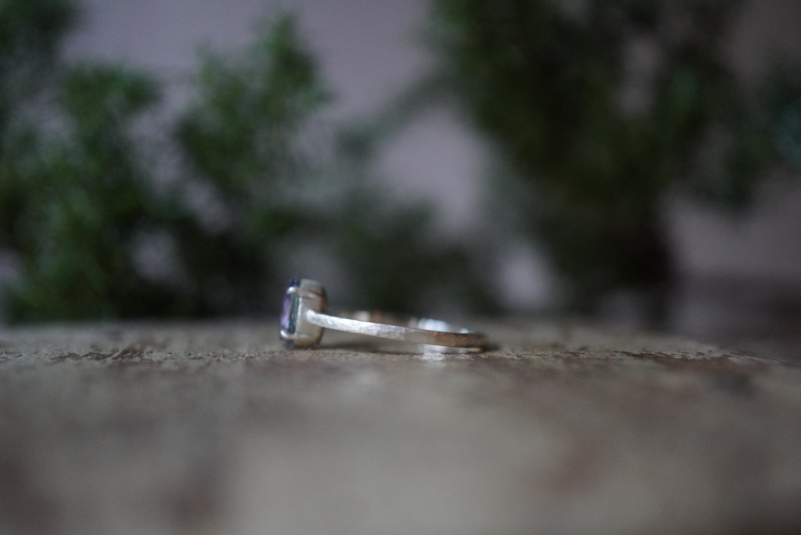 insulaが得意とするバイカラータンザナイトの指環です。この石は異国のミステリアスな夜空のような色をしています。深い青や紫、時には緑色にも変化しながらさまざまな表情を見せてくれる石。たくさんあるピースの中から指環にした時に映える石を選んで仕立てています。こちらはグリーンが強めに見られるピースですが、光源によっても色が変わる多色性の豊かな指環です。このサイズのバイカラータンザナイトのシリーズを「宵の空」と名付けています。