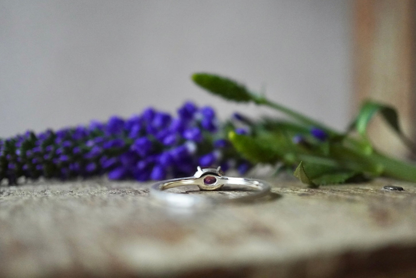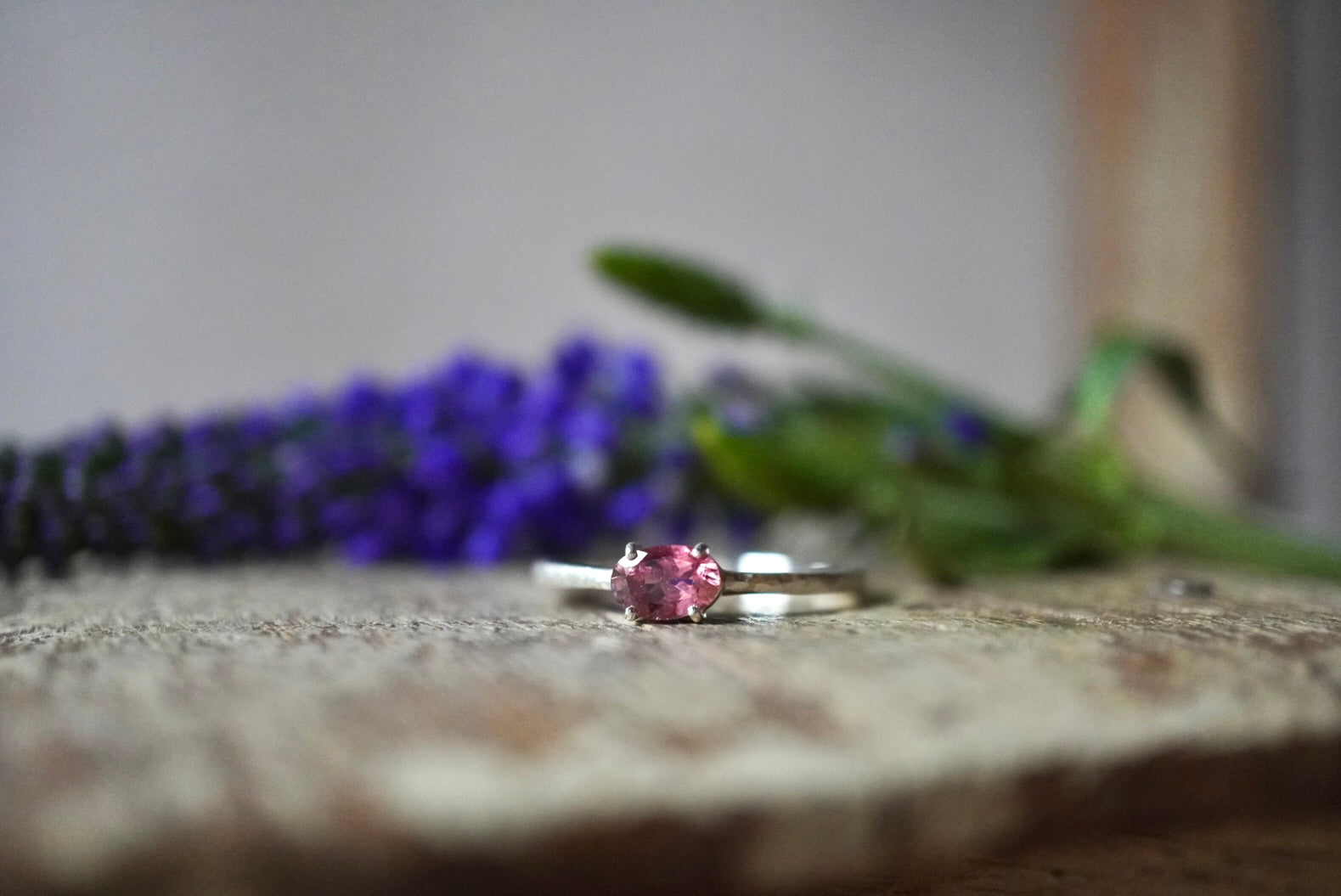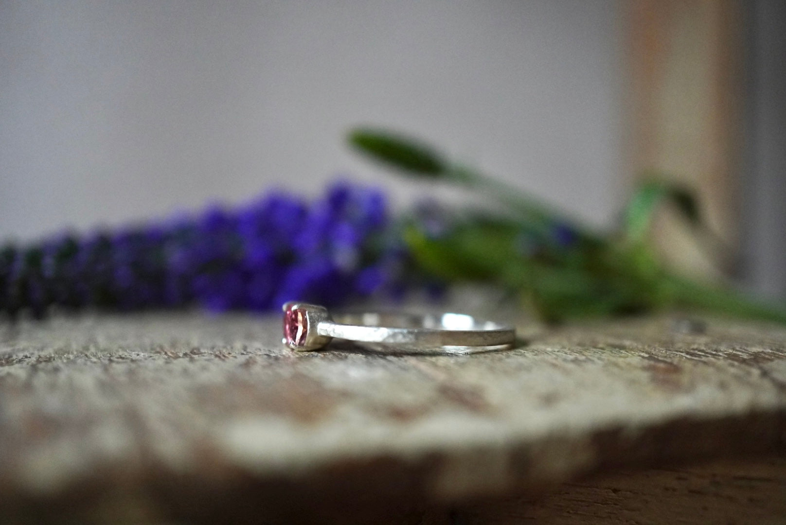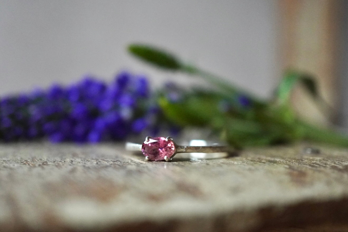 その中から、濃い桜色の石を選定しました。全体的にオレンジを含んだ濃い桜色は豊かな花のイメージを伝えてくれます。みずみずしくきらめく様はまるで生きているようにも見えます。冬に閉ざした心をそっと開いてくれるような石です。