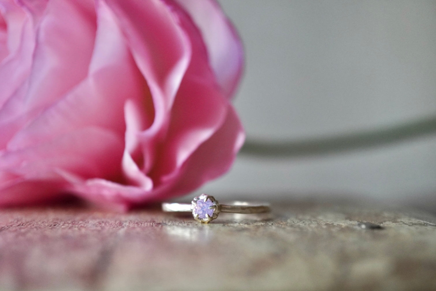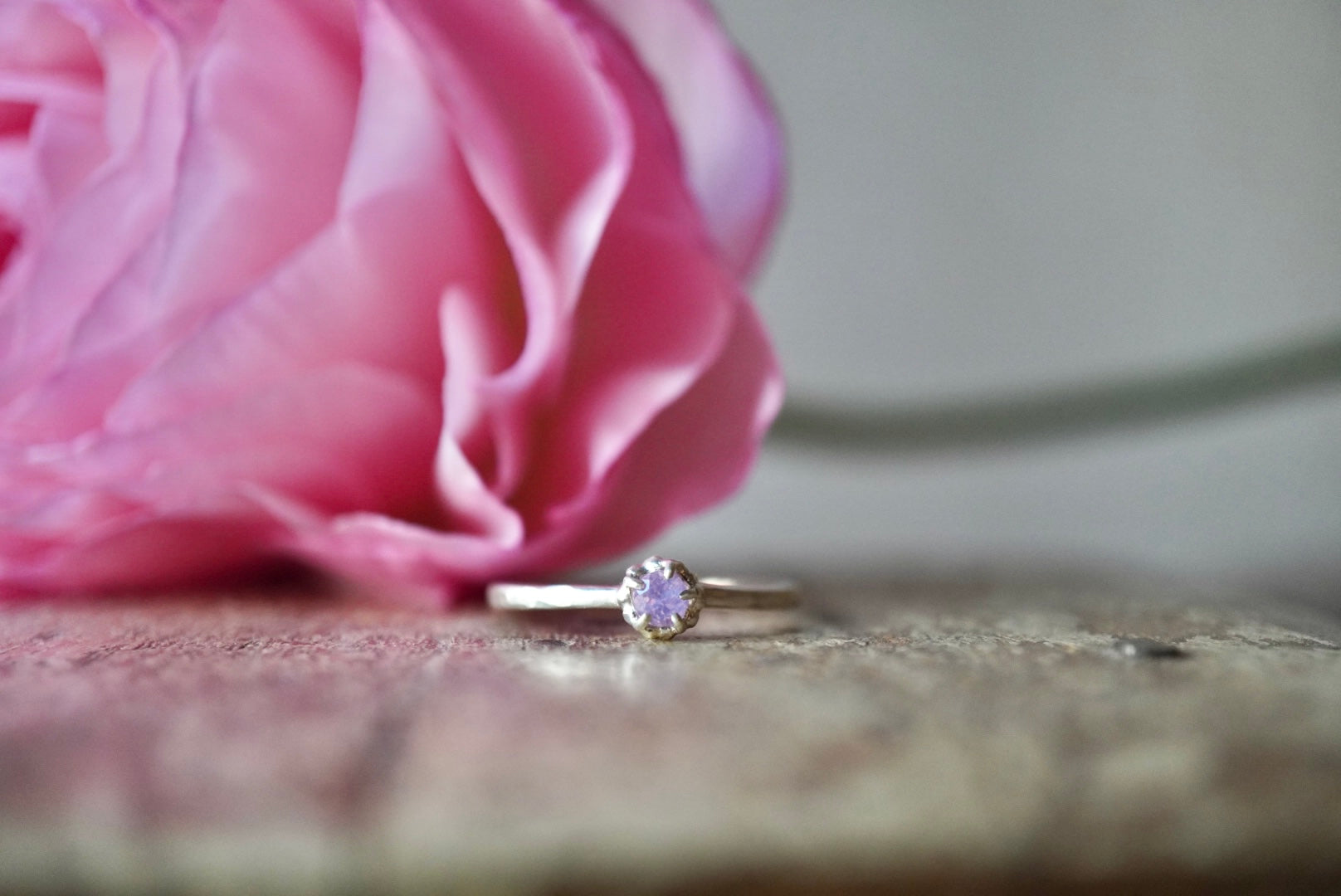 サファイヤの九割が加熱して色味を鮮やかに見せているものが多い中、こちらは非加熱でこの繊細な色を見せてくれています。まるで絹の布を一枚纏ったような乳白色が美しいサファイヤ。うっすらとした乳白色ながらもオレンジ色の光の反射を見せてくれる大変幻想的な石です。その中でも今回特に桜の花びらに見える色を選び指環にしました。青みのあるピンクにオレンジの光が反射するピースです。