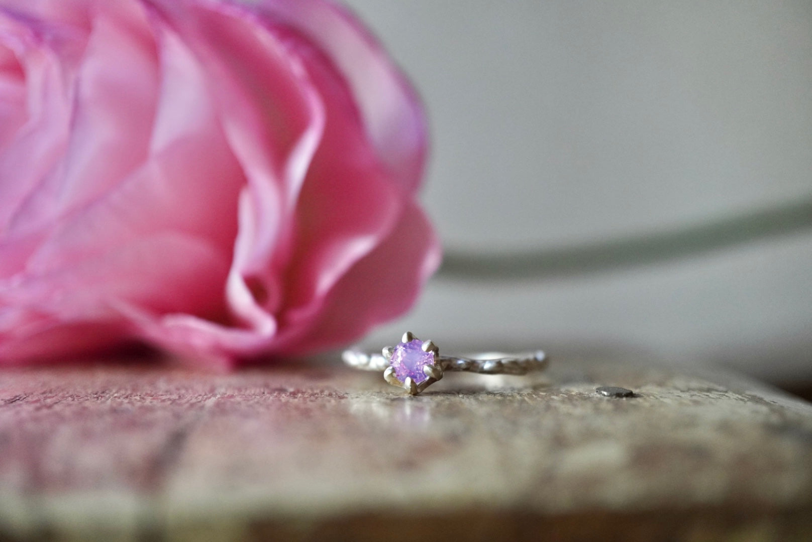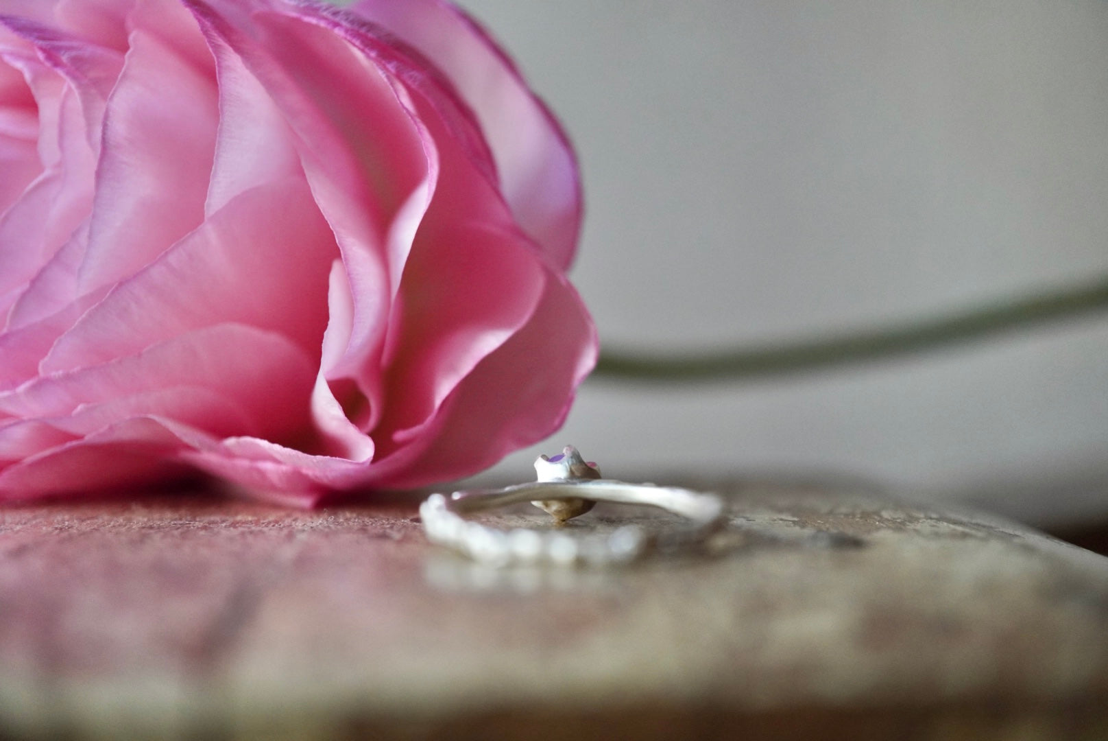 京都の山を眺めると山には雲か霞のように桜が多く咲いているのを目にします。比喩ではなく実際にけぶるような山の錦を思い浮かべ、シルキーな色から「花霞」と名を付けました。デザインはinsulaのオリジナルの雲の指環に蕾のようなクラウンで留めてあります。高さがあるので重ね付けがしやすい指環です。
