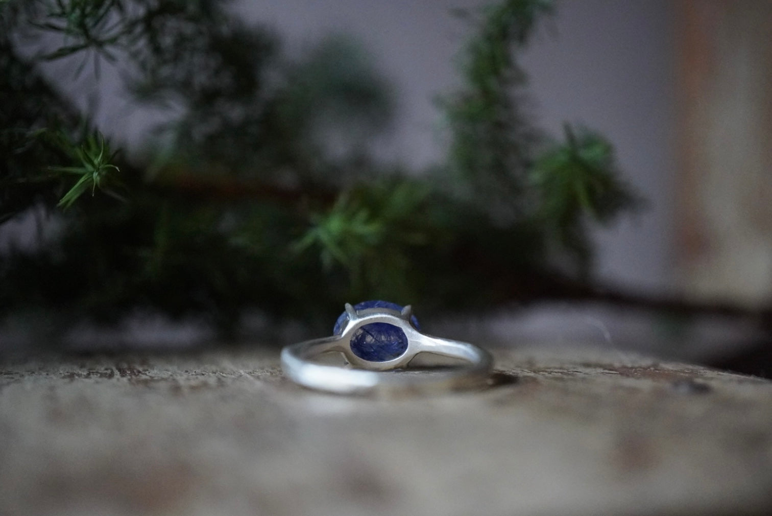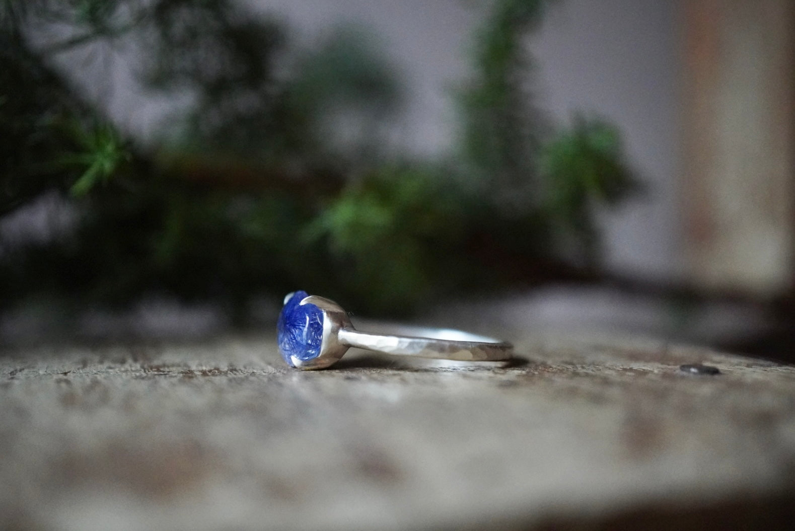 デュモルチェライトインクオーツは美しい青の結晶が特徴の石です。結晶が一部に見られるものが多いなか、こちらは前面に放射状の結晶が見える珍しいピースとなります。カボションカットが多い石でもありますが、こちらも珍しいファセットカットとなります。特徴的な青も鮮やかに、水晶の中に成長した鉱物の世界を楽しんでいただける指環です。