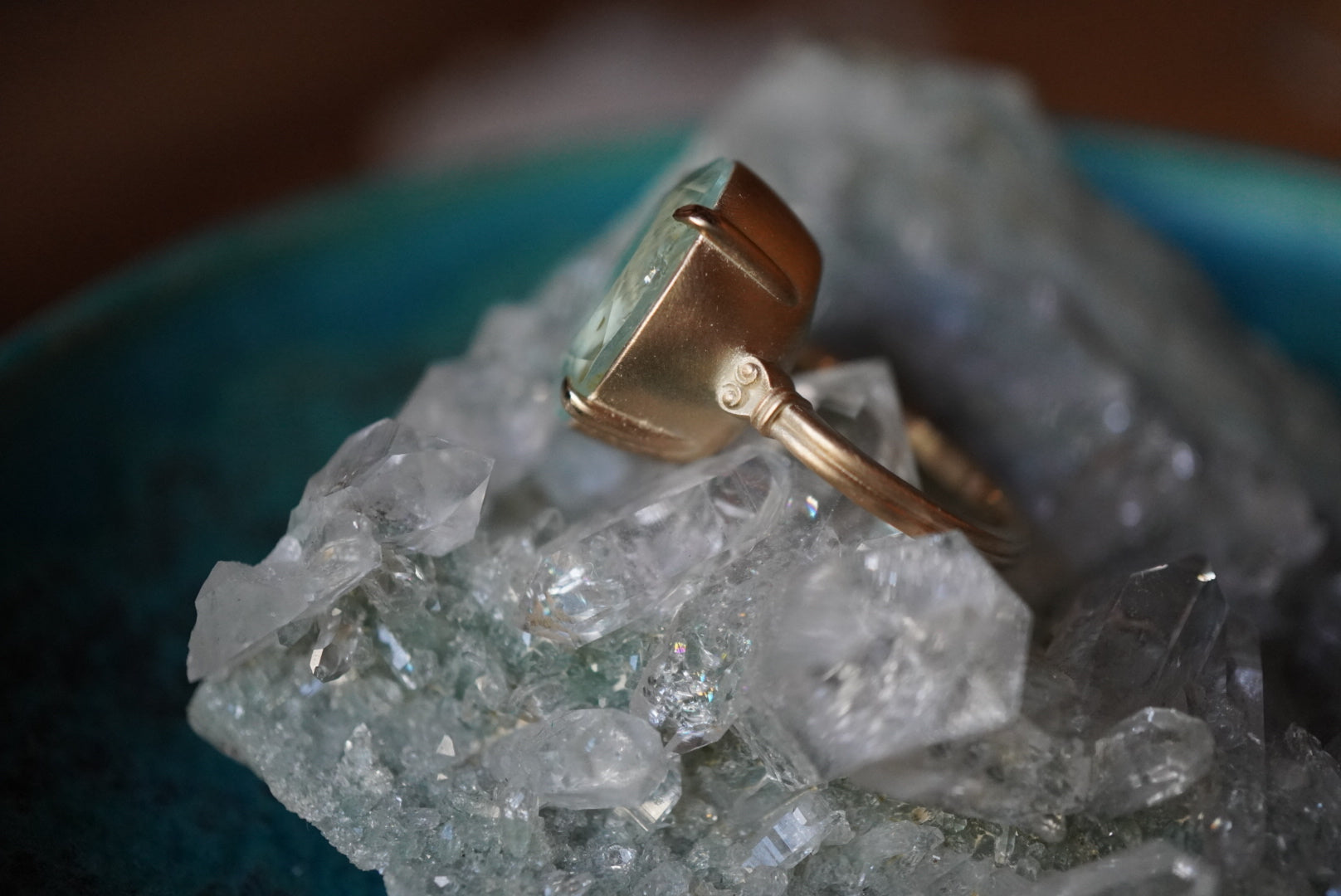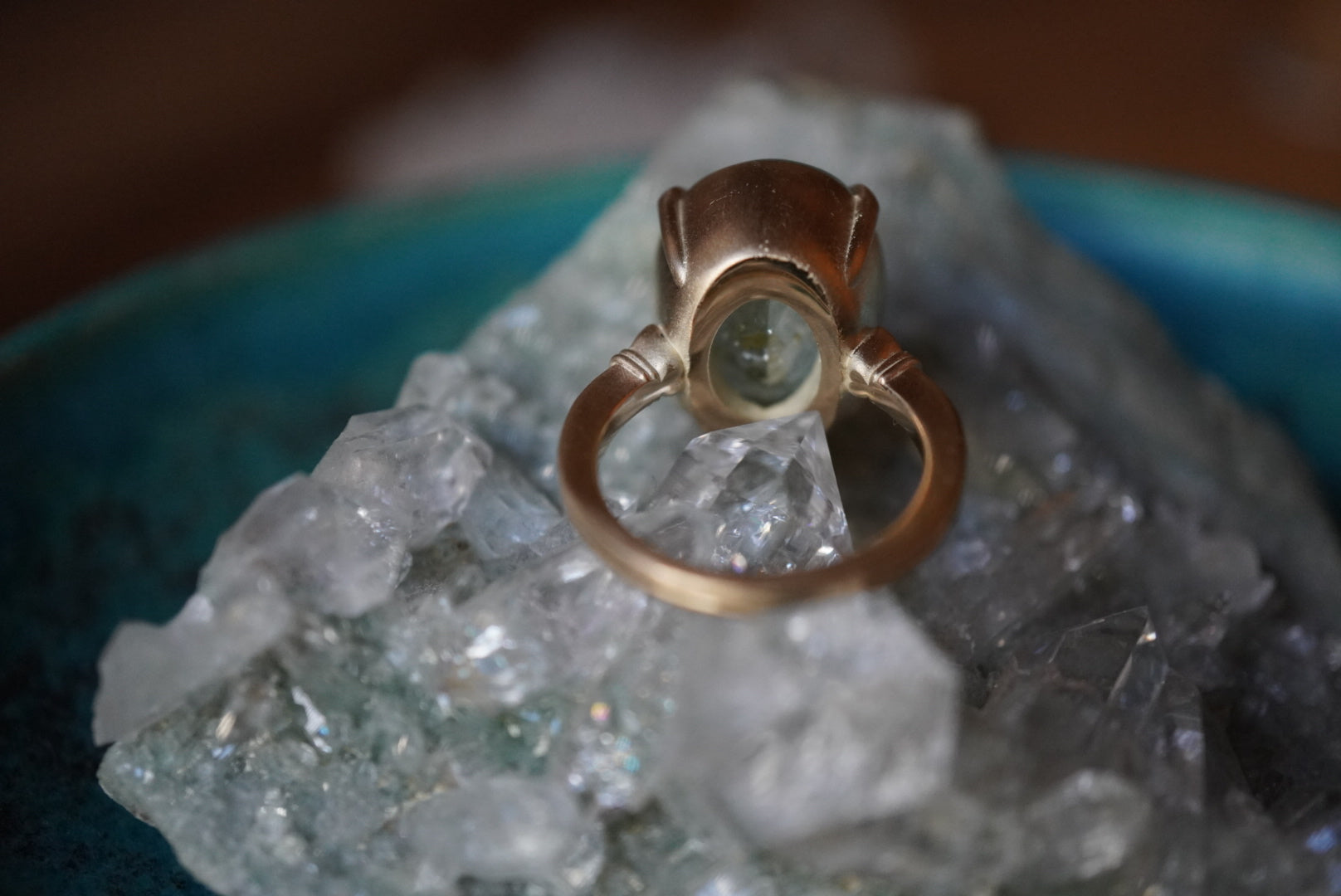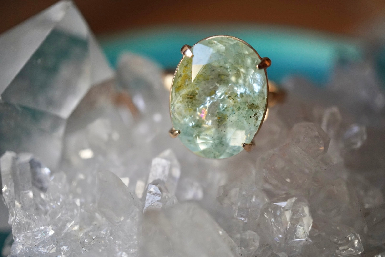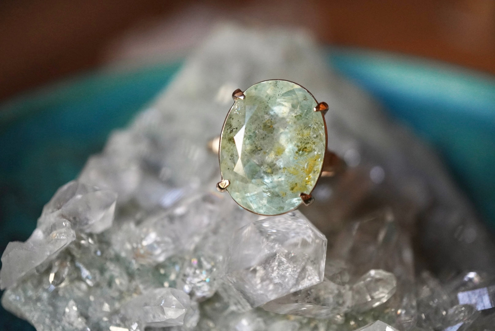 大粒のライモナイトインアクアマリンの指環です。黄色や灰色のライモナイトが水のようなアクアマリンの中に混在し、内包物やクラックに光が当たるときらきらと虹が光ります。地金をしっかりと使用しているので重さもありますが、その重さが安心感につながります。澄んだ水の流れを常に手元に置いておきたい方に。