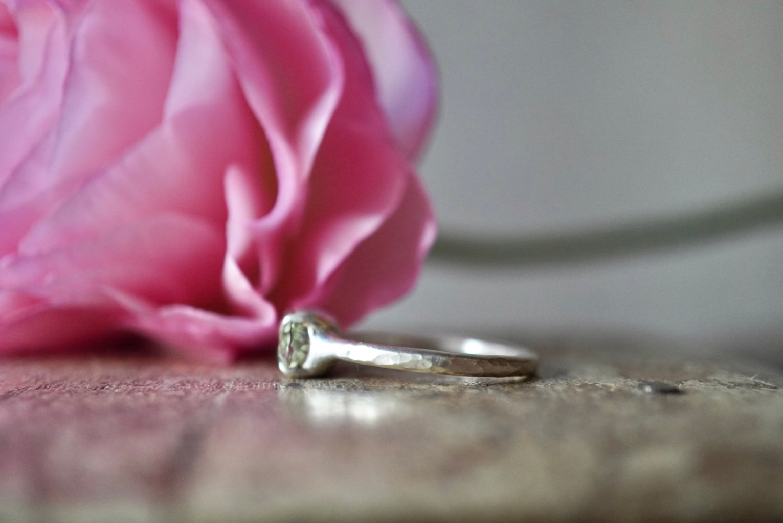 雨の降る新緑の季節の空気のようなうっすらと黄緑がかった石。まだ緑にも染まらずけぶった黄色の新芽が見せる命の輝き、それを育てる雨。そして一雨ごとに色を増し成長していく木々や花々。「村雨」は村に降る雨ではなく、まとまってさっと降る雨のこと。春から夏にかけて、命を育てる雨をイメージしました。