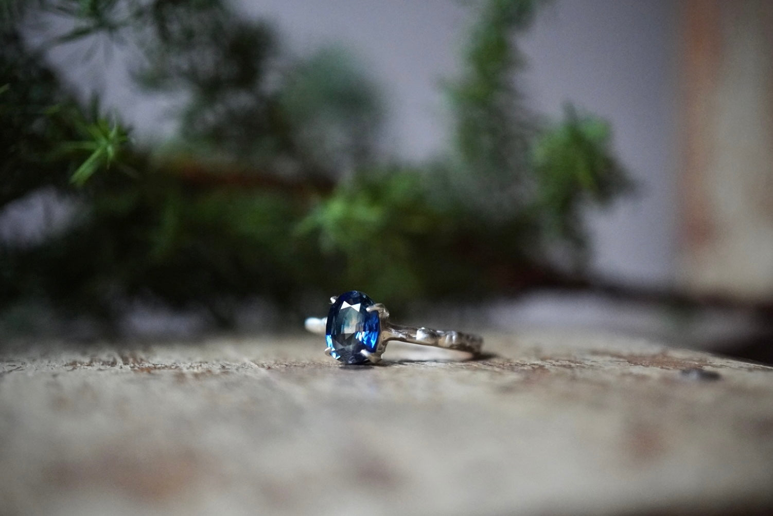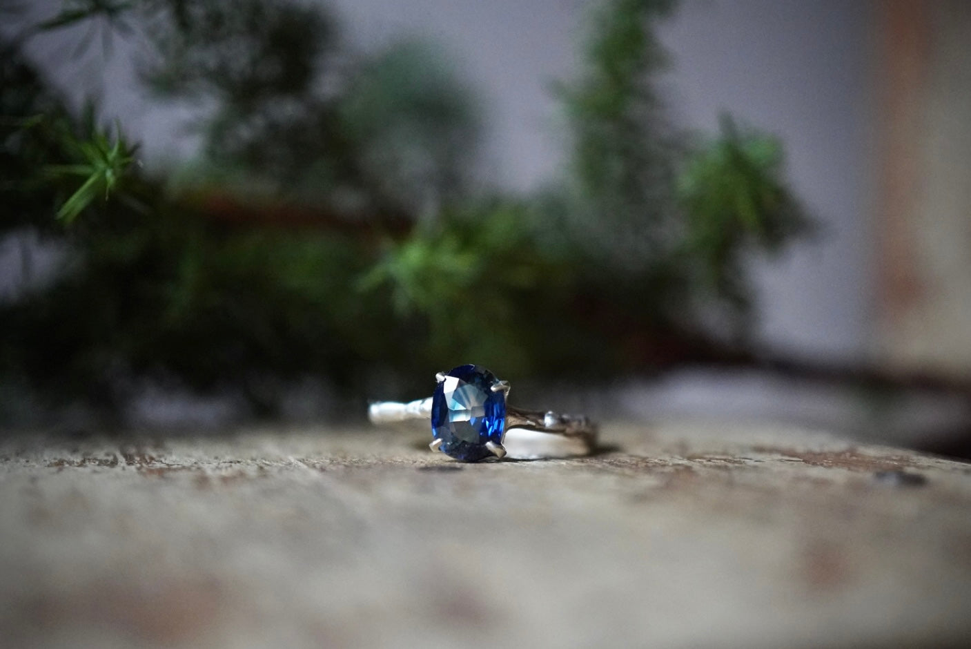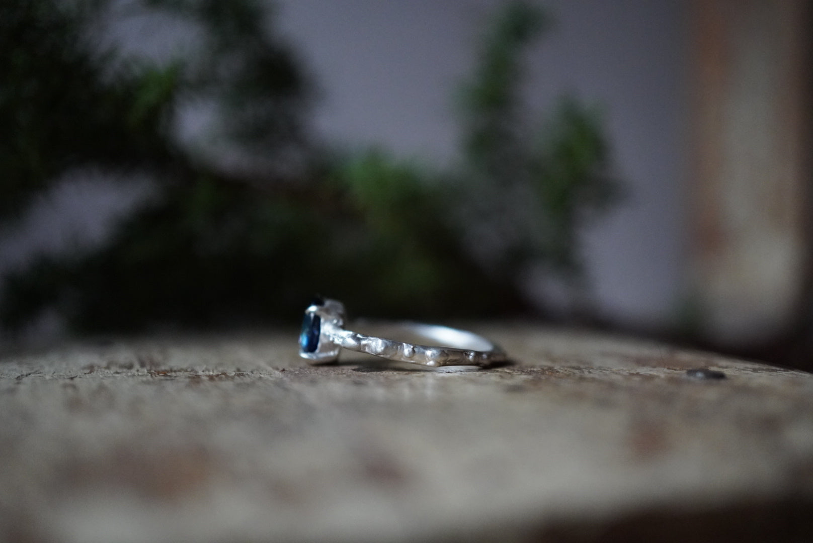 透明に見える部分が夜空を抱く山のように見えたので、キリマンジェロの山の名を付けました。角度によってブルーグリーンやロイヤルブルーが見え隠れする変化が楽しいバイカラーサファイヤです。ある程度の大きさがありますが、サファイヤなので硬度が高く、普段に使っていただける指環です。美しい夜空と聳え立つ山の景色を身につけることができます。