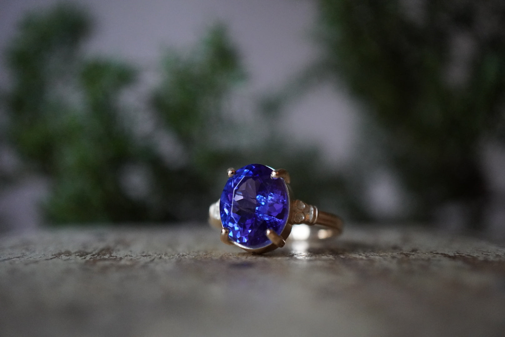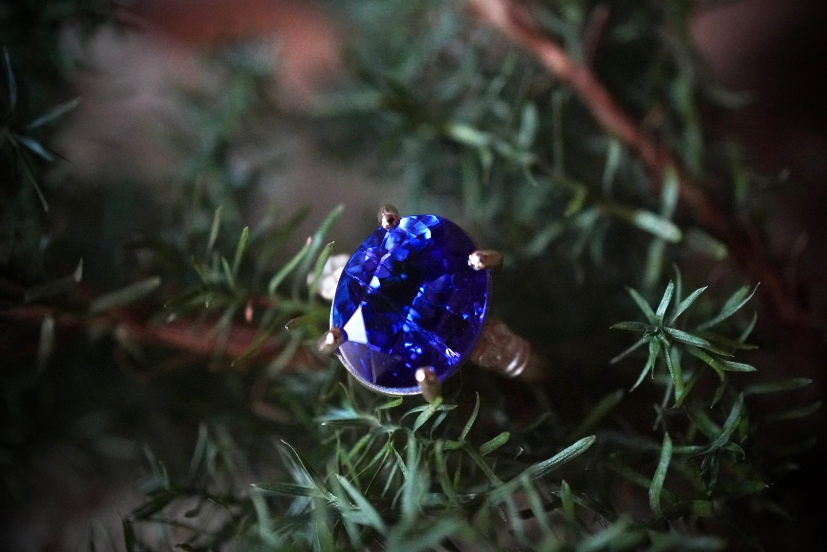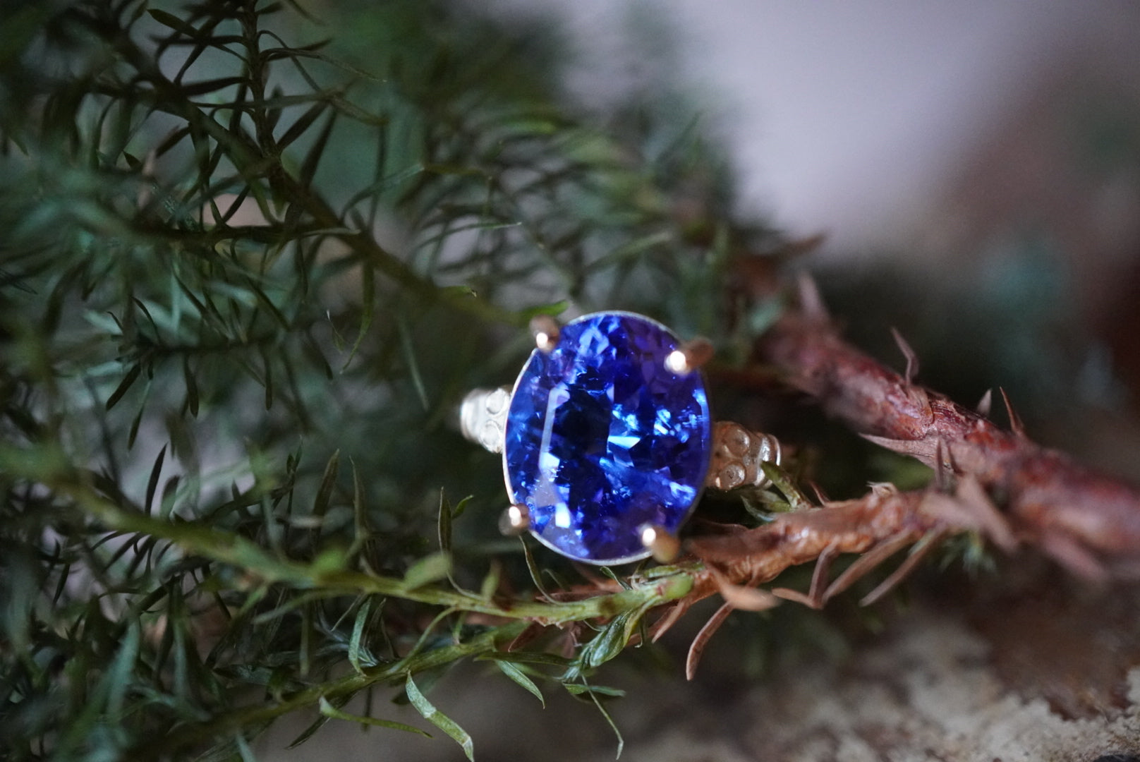 insulaで扱うタンザナイトの名でもとびきり美しい色と大きさの石を入手することができました。中央に大きくクラックが入っていますが、色の深みや多色性などどれをとっても人魅了せずにはいられないどきどきするような石をデザイン「唐草」でお仕立ていたしました。同じクオリティのタンザナイトは仕入れることが難しいでしょう。それほどの逸品となりました。大粒のタンザナイトに合わせてK10の地金をたっぷりと使った仕上がりに。とっておきのお守りの指環となってくれそうです。吸い込まれそうな青紫の色が明るい夜空や銀河のイメージであり、また宮沢賢治の「銀河鉄道の夜」のイメージにぴったりでしたので、引用させていただきました。