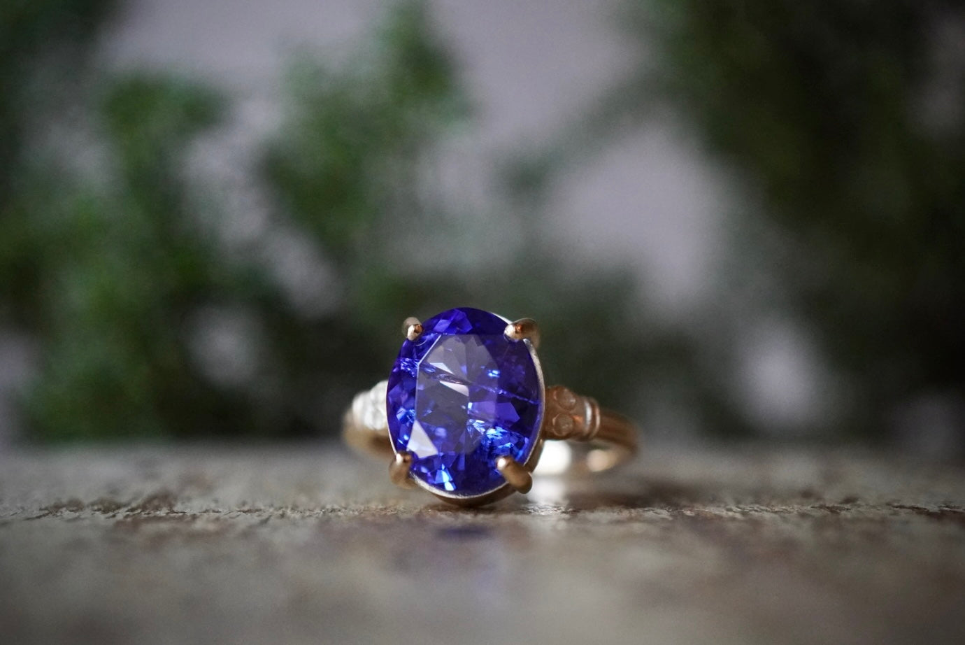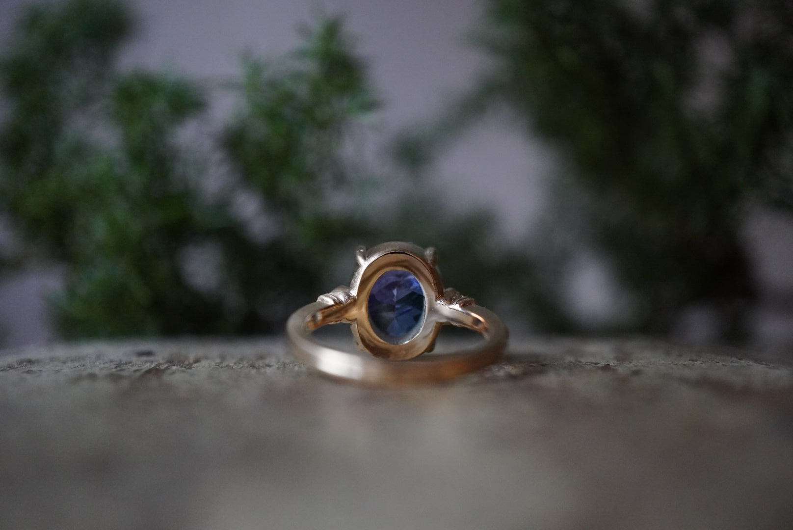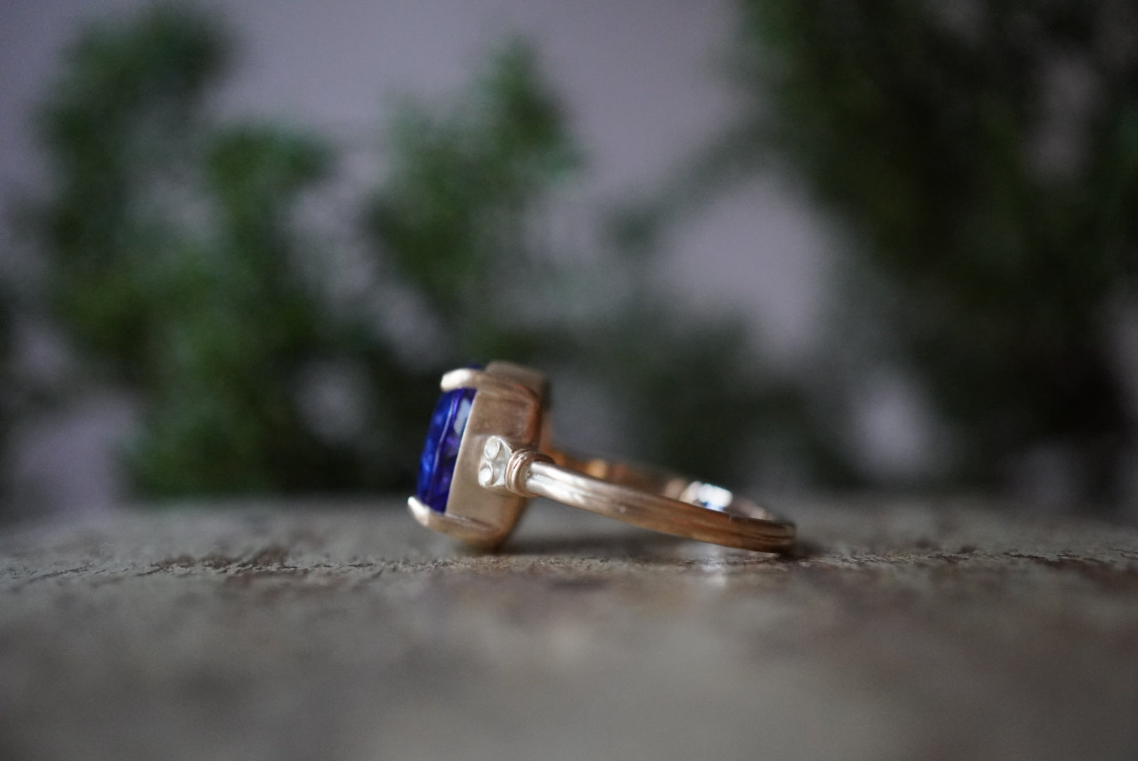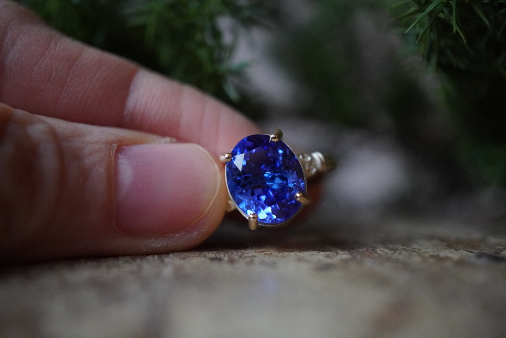 insulaで扱うタンザナイトの名でもとびきり美しい色と大きさの石を入手することができました。中央に大きくクラックが入っていますが、色の深みや多色性などどれをとっても人魅了せずにはいられないどきどきするような石をデザイン「唐草」でお仕立ていたしました。同じクオリティのタンザナイトは仕入れることが難しいでしょう。それほどの逸品となりました。大粒のタンザナイトに合わせてK10の地金をたっぷりと使った仕上がりに。とっておきのお守りの指環となってくれそうです。吸い込まれそうな青紫の色が明るい夜空や銀河のイメージであり、また宮沢賢治の「銀河鉄道の夜」のイメージにぴったりでしたので、引用させていただきました。